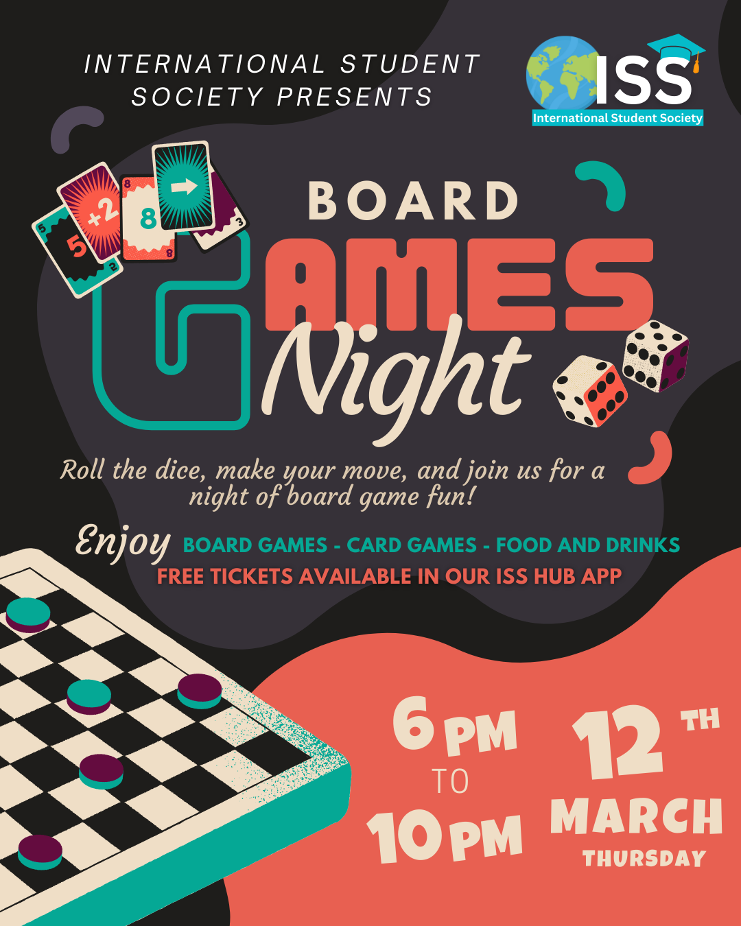 "Roll the dice, make your move, and join us for a Board Games Night with ISS! This is a relaxed, social evening where you can enjoy classic board games, card games, and plenty of good company. Perfect if you’re looking for a chilled night on campus, whether you come with friends or join a table and meet new people. ? Thursday, 12th March ? 6:00 PM – 10:00 PM ? Free tickets required ? Food and drinks will be provided, so just bring yourself and be ready for a fun, laid-back evening. ?? Tickets are free but limited — booking through the ISS Hub app is required."