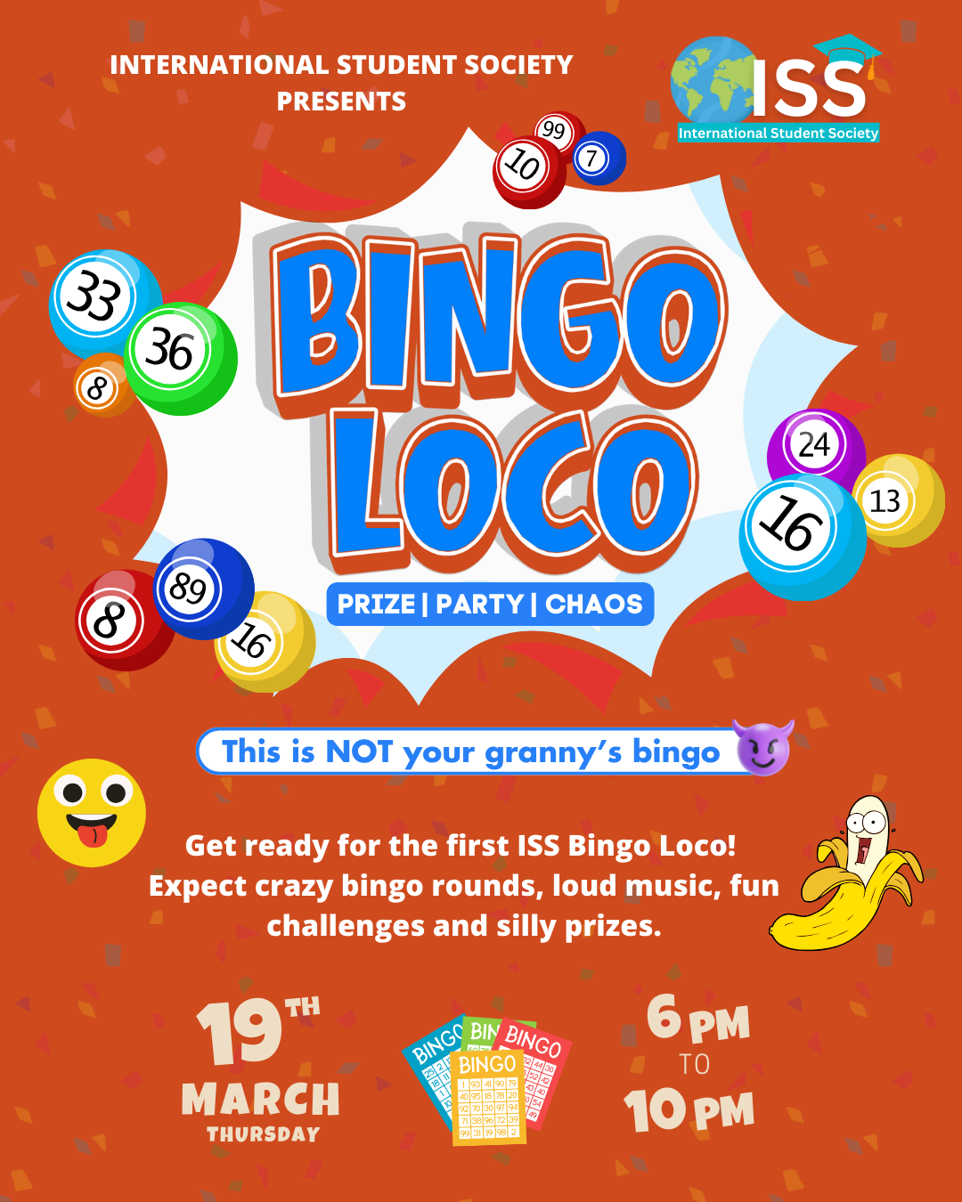 "Get ready for the wildest bingo night of the semester — welcome to ISS Bingo Loco! ?? This is not your granny’s bingo ? Expect crazy bingo rounds, loud music, fun challenges, and silly (but amazing) prizes throughout the night. This event is all about high energy, laughs, and a party atmosphere — even if you’ve never played bingo before! ? Date: Thursday, 19th March ? Time: 6:00 PM – 10:00 PM ? Location: Room 1036 ? Tickets: FREE (ticket required via ISS Hub App) ? What to expect: Multiple bingo rounds with twists Party vibes & loud music Fun challenges during the games Prizes, chaos, and great memories ? Free ticket required to attend — make sure to secure yours on the ISS Hub App."